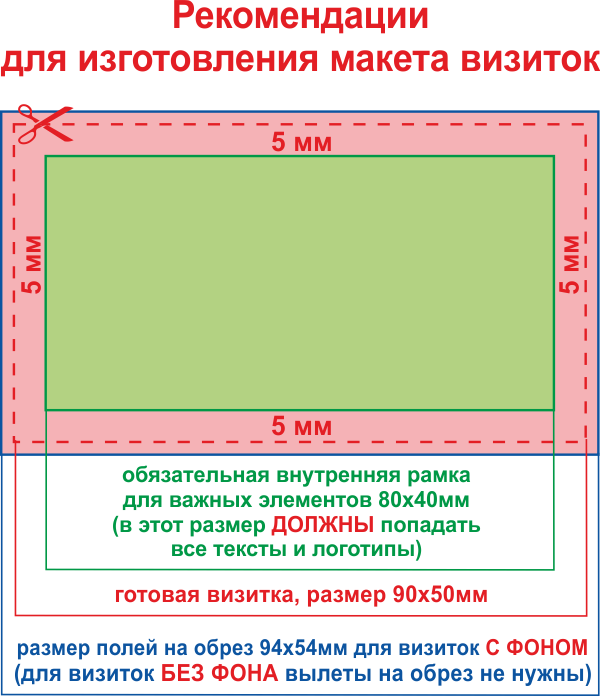 - При наличии фона добавляются поля на обрезку (вылеты) в размере 2 мм по периметру. (пример: макет визитки 90х50 мм, размер листа с вылетами по 2 мм будет 94х54 мм).
